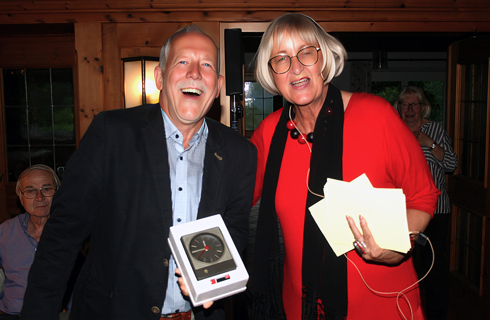 Raimund Hartmann und Monika Schwarz, in perfekter Abstimmung, verabschieden die Kolleginnen und Kollegen, wie immer geschmückt mit Anekdoten und der Überreichung der beliebten Kaminuhr.