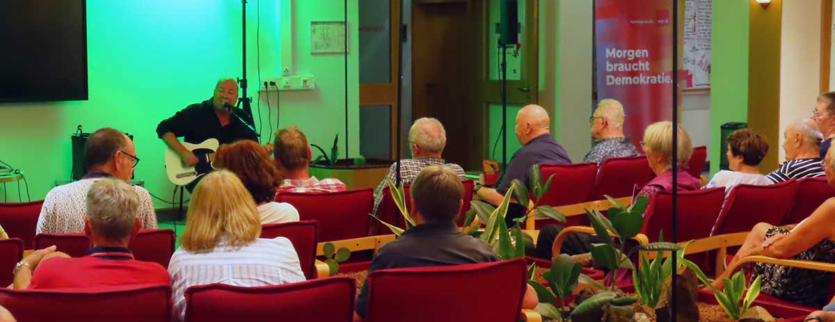 Den Auftakt am Mittwochabend bildete ein Kulturprogramm des politischen Liedermachers und Buchautors Kai Degenhardt. Für seine seit 1997 veröffentlichten 6 Alben erhielt er mehrere Auszeichnungen. Für uns las er Texte aus seinem Buch „Wessen Morgen ist der Morgen“, begleitet von Liedern der Arbeiterinnen und Arbeiter.