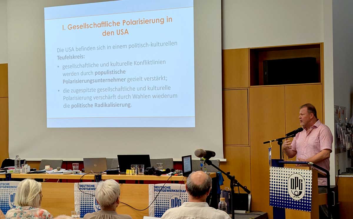 Er referierte zu dem Thema „Die Krise der amerikanischen Demokratie – Polarisierung, Radikalisierung, Widerstand“